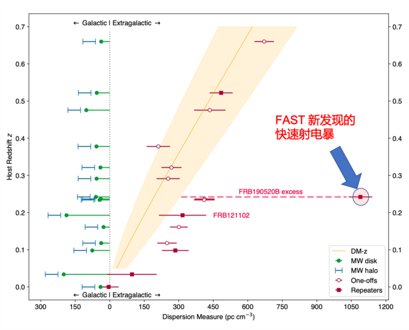 此后,通过美国帕洛玛200 英寸望远镜和凯克望远镜,加拿大-法国-夏威夷望远镜和日本斯巴鲁近红外光学望远镜,研究者确定了FRB20190520B的宿主星系和红移,推导出其宿主星系贡献了总色散值的80%,为目前已知所有快速射电暴源中最高的。