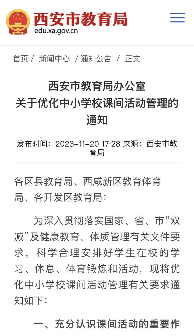 此次西安市教育局出台的相关“通知”,提出多项明确要求。其中包括:每节课间,应安排学生走出教室,通过适度活动或远眺等方式放松休息。班主任、各学科教师要按时下课,不得采取“拖堂”或其他方式挤占学生课间休息时间,不得对学生课间活动设置不必要的约束,要督促动员学生课间走出教室、到户外活动。每天上、下午各组织一次眼保健操。