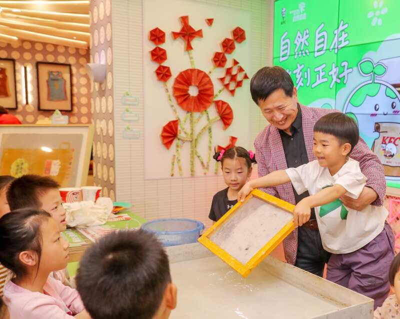 中国青年报客户端讯(中青报·中青网记者胡春艳)世界地球日来临之际,由天津市生态环境局指导,天津肯德基有限公司主办的“自然自在,此刻正好—餐厅里的环保艺术展”亮相。小朋友们在天津西青区美术家协会主席、天津师范大学美术与设计学院教授李桂金,天津大学工笔重彩研究所博士生导师曹铁娃教授的指导下,学习环保制纸、在随行包上绘制环保作品。