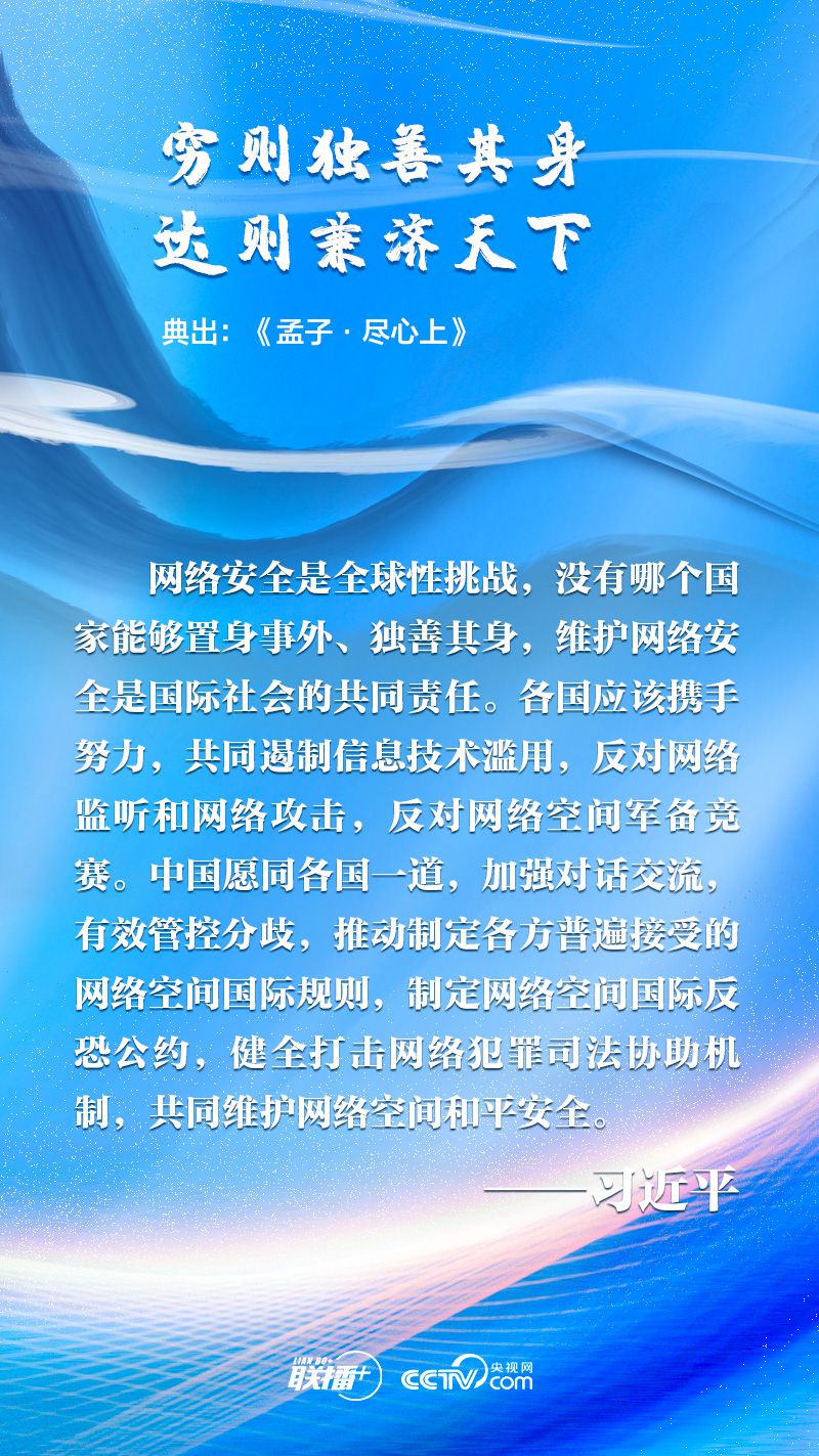 联播+ “网络空间是人类共同的活动空间,网络空间前途命运应由世界各国共同掌握。各国应该加强沟通、扩大共识、深化合作,共同构建网络空间命运共同体。”
