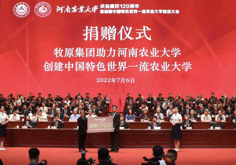 7月6日,在河南农业大学120周年校庆大会上,该校1985级校友、牧原股份董事长秦英林向母校捐赠10亿元人民币,共建河南农大牧原畜牧产业联合研究院。 实习生 张文/摄