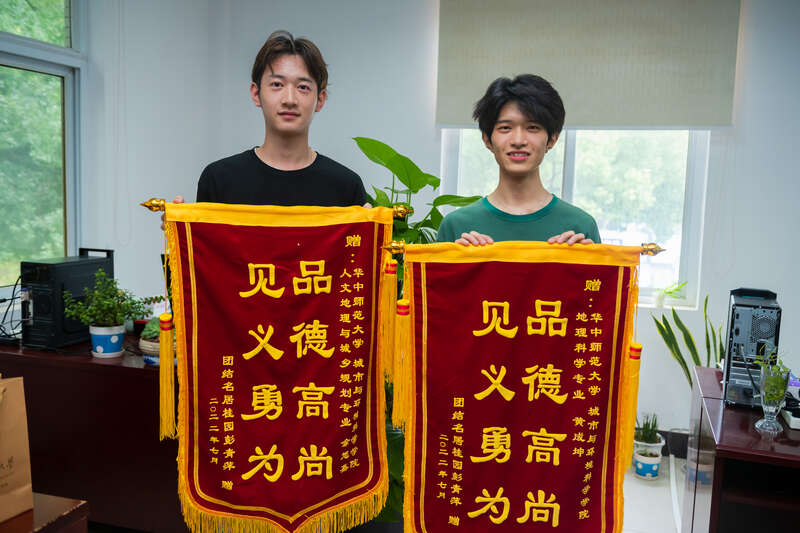7月5日,华中师范大学城市与环境科学学院2019级本科生黄成坤和2020级本科生余旭鑫分别收到了写着“品德高尚 见义勇为”的锦旗。