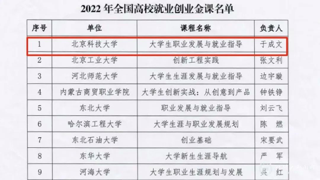 为加强就业创业名师金课建设,教育部学生服务与素质发展中心于2022年5月面向全国开展2022年全国高校就业创业金课评选工作,经北京科技大学申报、北京高校大学生就业创业指导中心推荐和教育部学生服务与素质发展中心遴选,最终确定北京科技大学《大学生职业发展与就业指导》等20门课程为“2022年全国高校就业创业金课”。