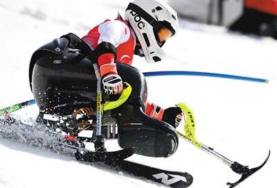 中国选手张雯静在残奥高山滑雪项目女子回转(坐姿)比赛中。