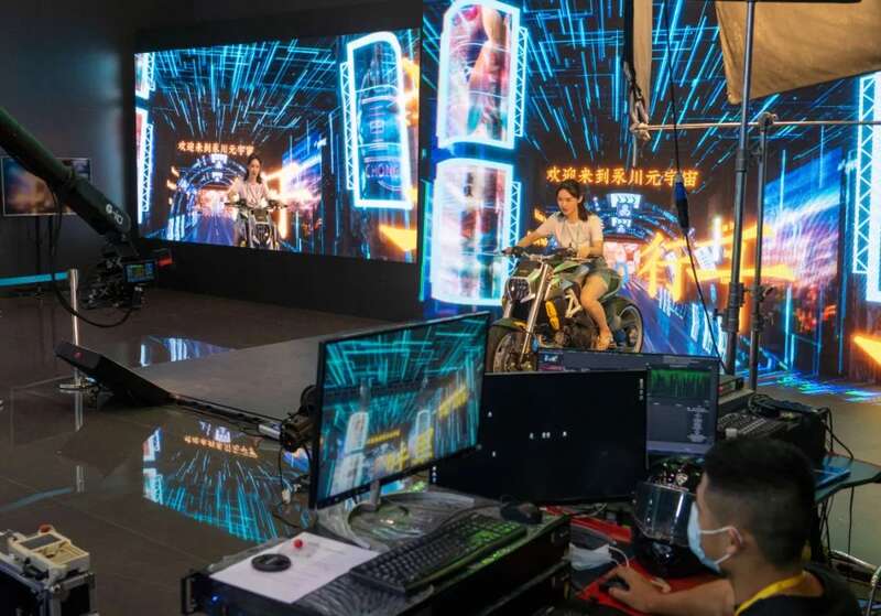智博会重庆展区,工作人员“驾驶”一辆摩托车“穿越”元宇宙世界。记者 崔力 摄/视觉重庆