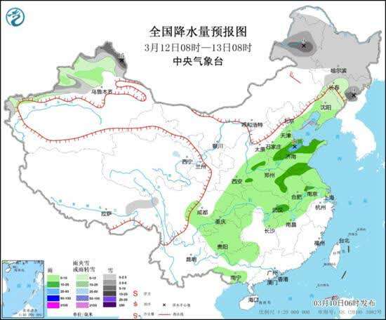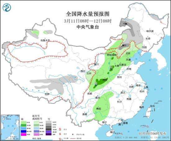 具体来看,明天内蒙古中东部、新疆伊犁河谷和南疆西部山区、西藏北部、青海南部、甘肃东部、河北北部、北京西部、辽宁西部等地部分地区有小到中雪或雨夹雪,其中,内蒙古东部部分地区有大雪(5~7毫米)。内蒙古中部、陕西、山西、河北中南部、北京中南部、天津、河南西部、四川东北部、重庆东南部、贵州大部、广西西部等地部分地区有小到中雨,其中,山西西南部、四川东北部等地部分地区有大雨(25~45毫米)。
