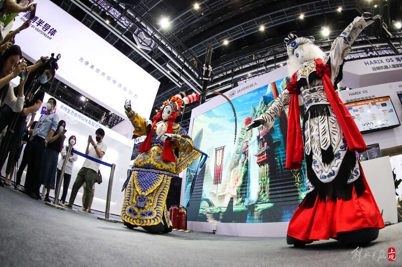 达闼自主研发的柔美人形机器人,身穿京剧服饰表演《大闹天宫》中的选段。