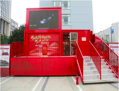 一辆停在复旦大学光华楼北侧停车场内的红色集装箱卡车格外引人注目,车身上方展开一面LED屏幕,以车体为中心摆放着48块系列展板。这辆红色巡展车是中共一大纪念馆为伟大建党精神专题展全国巡展精心打造的流动展车。