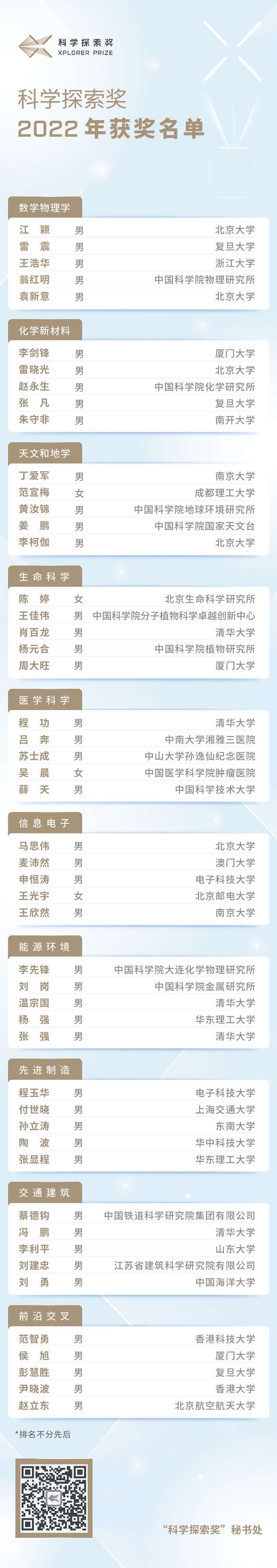 中国青年报客户端北京9月15日电(中青报·中青网记者 邱晨辉)今天,第四届“科学探索奖”获奖名单正式揭晓,50位青年科学家榜上有名,首位90后获奖人诞生,并评出首批医学科学领域获奖人。每位获奖人将在5年内获得总计300万元人民币奖金,并且可以自由支配奖金的使用。