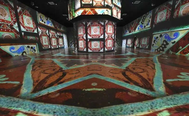 但舒适、长效的沉浸感,显然不能光靠视觉听觉的强行灌输,相伴技术应用,需要科学有效的艺术呈现促进观众的身心融入,以及认知与环境的交流。敦煌光影展中,依托常沙娜等艺术家的200余幅壁画作品展开美术设计,并特意遴选了藻井、中心塔柱窟等图案样式,进一步拓展沉浸演示。敦煌藻井纹样多达四百余种,实属“天花板”级的艺术品。莲荷纹、水涡纹、飞天纹等式样精致、五光十色,并各具不同时期的美学特点。经过放大、变形与拼接,再将视角由仰首转为环绕,藻井在重构之下,允许并鼓励观者零距离、全画幅感受,促成横看成岭侧成峰、远近高低各不同的美学观察与理解。以中心塔柱窟为灵感来源所设计的万花镜,亦有异曲同工之妙。