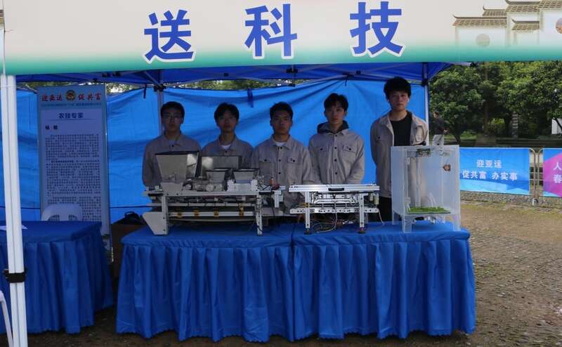 在富阳区龙门古镇,正直春耕季节,实践团的同学们带去了自主研制的最新科研成果——全自动智能穴盘育苗播种机。这是同学们通过实地调研,自主研发设计的播种机,具有成本低廉、播种效率高等特点。实践团成员拿着自主开发设计的装备走进乡村,通过现场展演、科技讲堂、一对一示范相结合的方式,指导农民学会操作和使用育苗播种机等助农科技产品。他们在现场送出了2000余株新育成的蔬菜种苗,耐心地向村民科普现代农业技术,详细讲解蔬菜种植与管理的技术要领。看完设备演示,农户竖起了大拇指。
