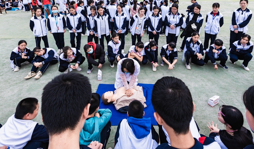 2022年11月8日,广东省连平县,连平中学运动场内人声鼎沸,连平中学和连平县第一初级中学各4个班共8个班约600名师生齐集,参加一场主题为“人人学急救,急救为人人”的应急救护进校园活动。活动先由专业救护人员现场讲解、示范教学气道异物梗阻急救、心肺复苏程序及操作技术,之后每个学生轮流在专业救护人员的指导下进行模拟操作,确保学生基本掌握所学应急救护知识和技能。