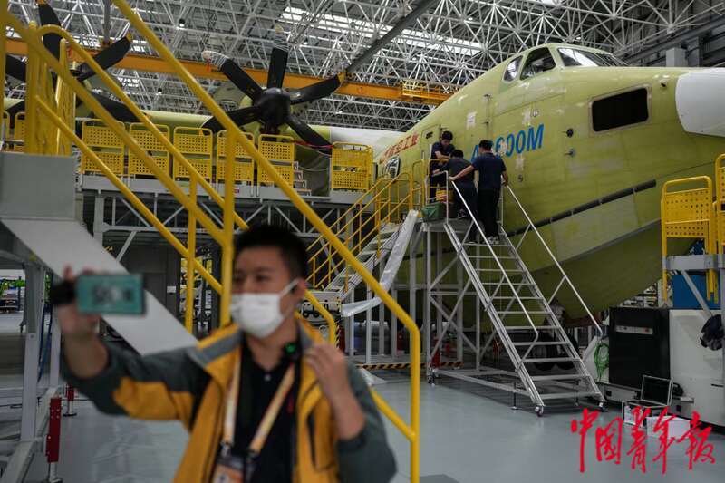 11月7日,广东省珠海市航空工业通飞珠海基地,参观者在拍摄总装线上的AG600飞机。中青报·中青网记者 赵迪/摄