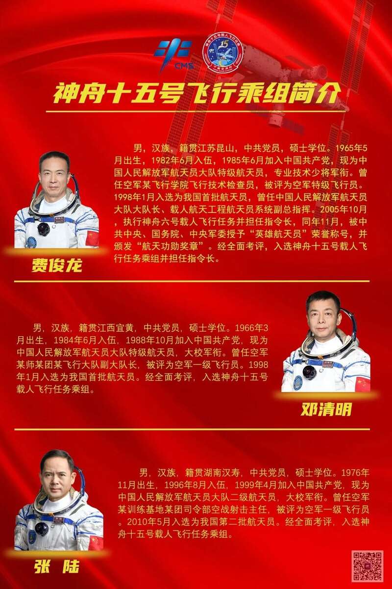 当天,中国载人航天工程办公室宣布,经任务总指挥部研究决定,瞄准北京时间11月29日23时08分发射神舟十五号载人飞船,飞行乘组由航天员费俊龙、邓清明和张陆组成,费俊龙担任指令长。