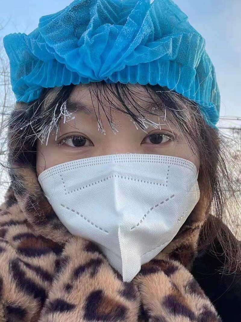 由于气温过低,即便身穿两件羽绒服,她的手脚也冻得发麻,头发上、睫毛上也盖上了一层薄薄的冰晶。