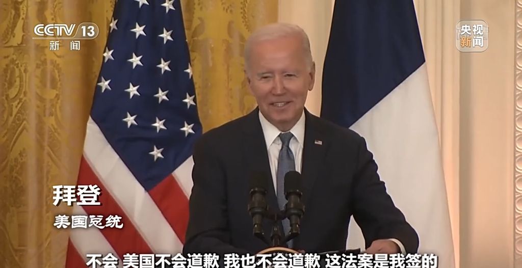 12月1日,在拜登为马克龙举行国宴的下午,有记者就此事向拜登提问,拜登的回答干脆利落。他说:“不会,美国不会道歉,我也不会道歉,这法案是我签的。”