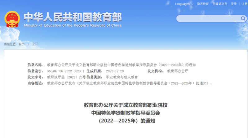 教育部办公厅关于成立教育部职业院校中国特色学徒制教学指导委员会(2022—2025年)的通知。教育部官网截图