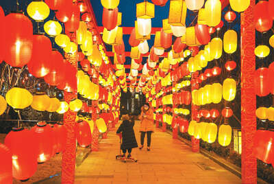 春节临近,山东省临沂市银雀山兵学文化公园张灯结彩,夜晚灯光璀璨。许传宝摄(人民视觉)