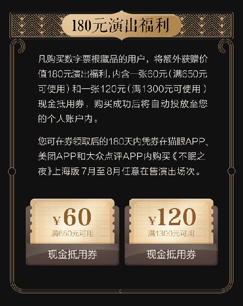 同时,作为猫眼首期与浸入式戏剧主题相结合发售的数字藏品,在发售过程中推出了线上线下联动的发售模式。据猫眼官方信息显示,在《不眠之夜》数字藏品发售过程中,凡购买该数字藏品的用户,将额外获赠价值180元的演出福利,内含一张60元(满650元可使用)和一张120元(满1300元可使用)现金抵用券,购买成功后将自动投放至用户账户内,用户可在有效期内可凭券在猫眼App、美团App和大众点评App内购买《不眠之夜》上海版正式复演后(7-8月)的任意在售演出场次。