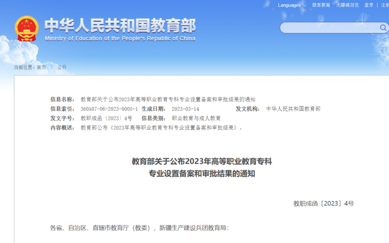 教育部关于公布2023年高等职业教育专科专业设置备案和审批结果的通知。教育部官网截图