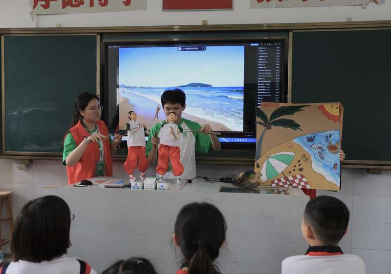 汕头大学科普实践团跟随潮汕非遗传承人学习传统技艺——铁枝木偶戏。实践团成员设计了一套故事剧本,创新性地将传统节气、生态环保、海洋生物等科普知识融入传统铁枝木偶戏剧表演。在金砂小学,他们让传统文化在课堂中“活”了起来,小学生在感受传统文化魅力的同时,也逐渐明白了人与自然和谐共生,更加明白了“绿水青山就是金山银山”所蕴含的道理。