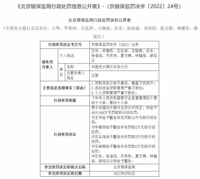 中新财经6月13日电 据中国银行保险监督管理委员会网站消息,近日,中国光大银行北京分行因贷款风险分类不真实掩盖不良资产、流动资金贷款管理严重不到位、个人贷款管理严重不到位等,被北京银保监局责令改正,并给予合计300万元罚款的行政处罚。(完)