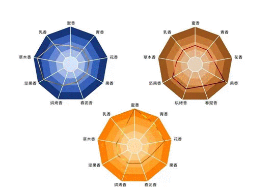 2022年,随着馥郁香型白酒国标正式实施,更多人关注到了馥郁香的“三生之妙”。为了能让消费者对馥郁香的丰富口感有更直观的理解,内参酒·三生万物首次采用由中粮营养健康研究院呈现的“感官雷达图”,科学表达馥郁香的三种口感,以草木香、坚果香、烘烤香、春泥香、果香、花香、青香、蜜香、乳香等9大主要香气组成9大维度,并通过二维图形展示多维数据,精准呈现同一种香型三种风味的口感特质,更加科学立体地诠释产品特性,给人耳目一新的创新体验。