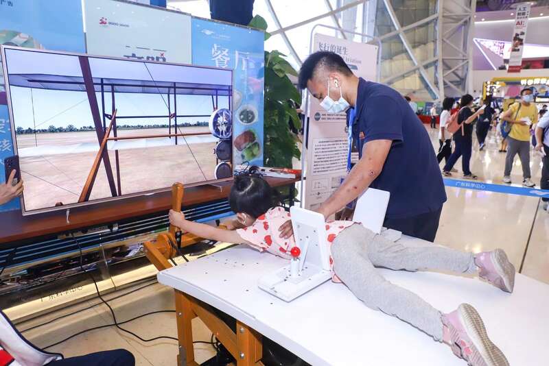 在小翼航空模拟体验区,公众可以了解到北斗卫星、飞机黑匣子等相关技术的重要作用。现场,多种VR、AR和XR等高新技术,让公众沉浸式学习不同火情场景下,科学使用灭火器,甚至穿越时空,来一场元宇宙探梦之旅。