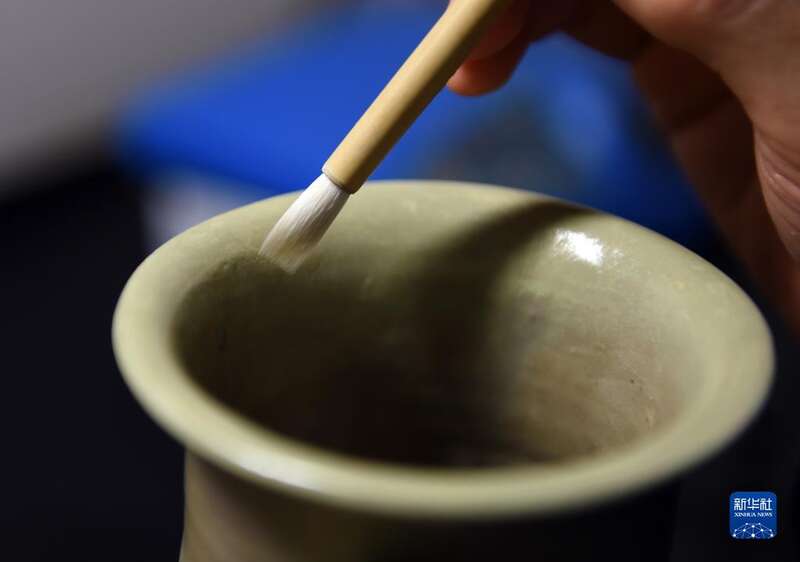 5月17日,在安徽博物院文物科技保护中心陶瓷器保护修复室,工作人员对瓷器文物进行作色。新华社记者 周牧 摄