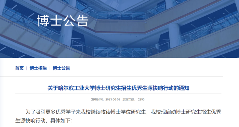 中国青年报客户端讯(中青报·中青网记者 叶雨婷 通讯员 商艳凯)记者从哈尔滨工业大学获悉,近日,哈工大研究生招生网发布《关于哈尔滨工业大学博士研究生招生优秀生源快响行动的通知》指出,学校创新形式,启动博士研究生招生优秀生源快响行动,根据生源报名情况,学校一般每月集中一次对学院上报的优秀生源快响名单进行复审,并确定其预录取资格。