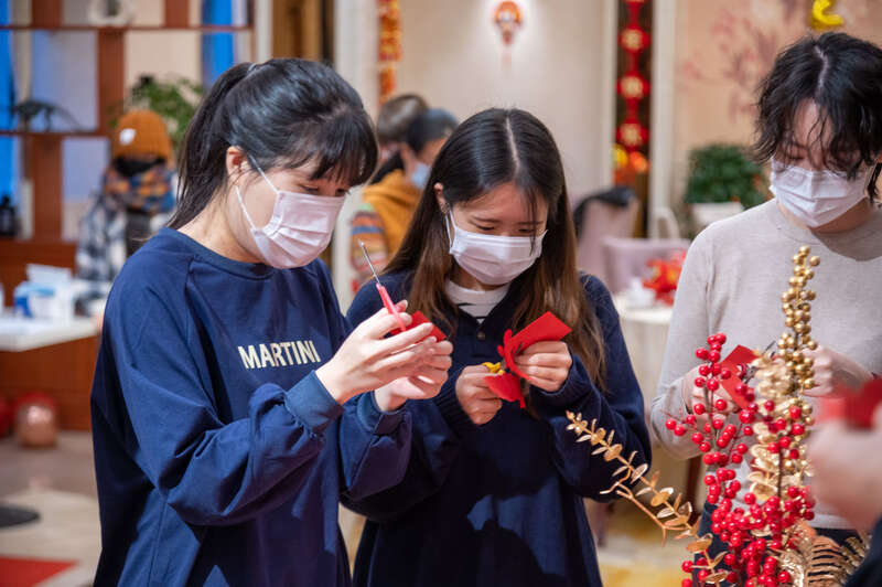来自的韩国留学生李华静走进浙江万里学院餐厅,就被过年喜庆气氛所感染。她说,自己特地穿上红衣服,在老师的指导下剪纸,很快一幅漂亮的窗花就完成了。李华静同学还现场学写福字。韩国启明大学的交换生们则用中文给大家祝福新年。