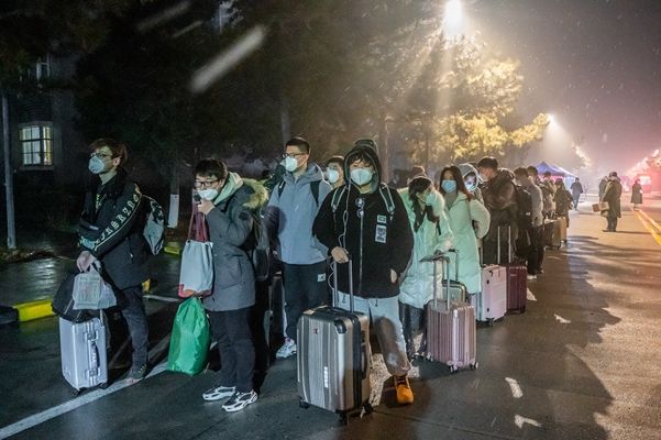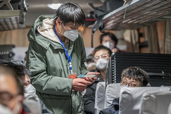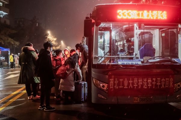 2022年1月24日凌晨,西安,西北工业大学长安校区,数十辆大巴车开入校园,长安校区首批离校返家学子在学校的暖心护送下,点对点转运至西安市内“两站一场”,有序踏上返家之路。