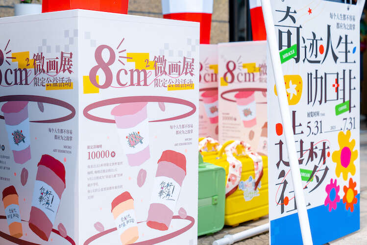 今年5月31日至8月31日,奉浦街道的爱心青年们与属地商铺合作,在8家咖啡店内为特殊儿童们举办了“微画展”,为孩子们搭建展示自我风采的舞台。“微画展”将惠敏学校学生的绘画作品及奉贤中专特教班学生提供的文字印制在8c㎡大小的杯套上,制成了1万个“限定款咖啡杯套”,由爱心咖啡店铺认领。咖啡店每售出一杯咖啡,就为特殊儿童捐出1元爱心善款。此外,辖区的爱心人士和爱心企业也通过捐款、捐物等方式参与了活动。