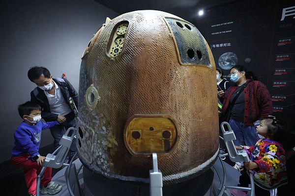 2022年5月14日,成都市民观看中国航天文创首个官方艺术特展《漫无边界》,青少年观众在沉浸式观展中探索浩瀚宇宙,探秘宇宙中的未知领域。