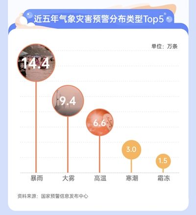 近5年,国家预警信息发布中心平均每年发布19.5万条气象预警信息,暴雨、大雾、高温是发布最多的气象灾害预警。