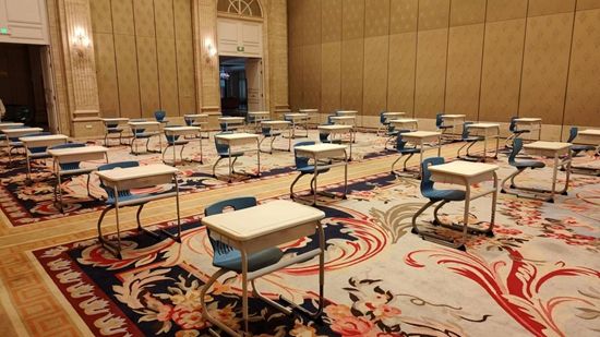 完成报到程序后,考生在工作人员引导下,领取房卡,进入自己的房间。考场设置在一层大厅的会议室里,桌椅的高矮、黑板等设施都是按照考生平日在学校的标准配置的,座位布置严格按照防疫要求,保持安全距离,每个考场可容纳30名考生。