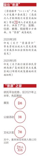 2020年3月,景德镇市政府办印发《关于“景漂景归”等来景创业就业人员及其随迁家属参加社会保险的实施意见》;同年5月,景德镇市招才引智局联合市公安局印发《关于执行国家移民管理局推广复制国家重点发展区域12项便利政策措施的实施细则》……