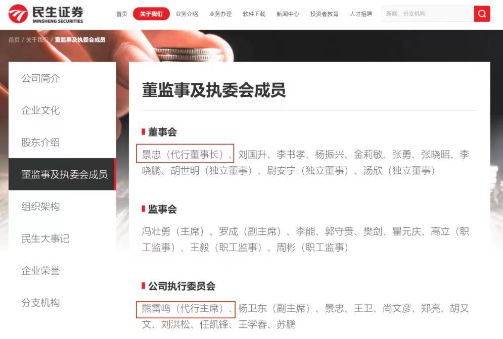中新经纬6月17日电 (马静)17日,据中新经纬向民生证券有关人士确认,民生证券已经召开股东大会和董事会,推举原副总裁景忠和熊雷鸣分别代行董事长和总裁职责。   民生证券高级管理层变动