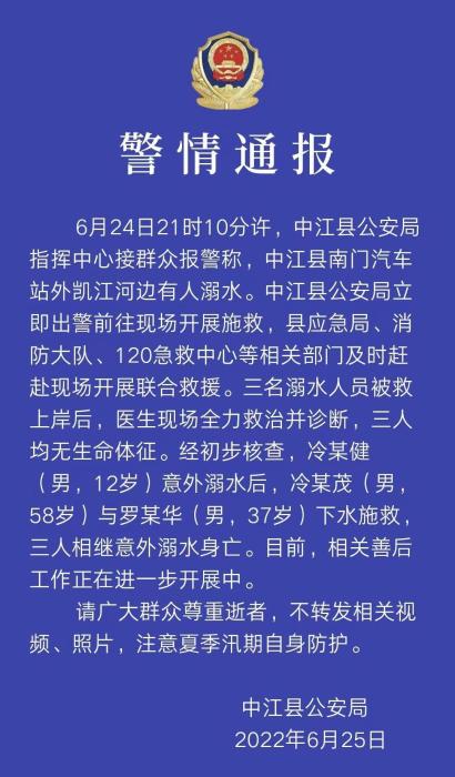 四川德阳中江县警方25日发布通告:6月24日21时10分许,四川德阳市中江县公安局指挥中心接群众报警称,中江县南门汽车站外凯江河边有人溺水。中江县公安局立即出警前往现场开展施救,县应急局、消防大