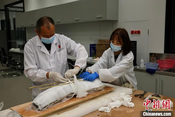 广汉7月14日电 题:走进三星堆“象牙修复突击队”:如何攻克世界性文保难题   记者 贺劭清 岳依桐 “象牙修复突击队”用绷带胶条固定象牙。 受访者供图   “在高湿度的土壤中