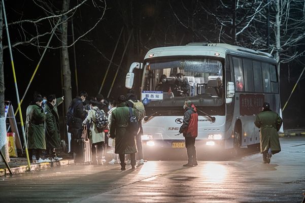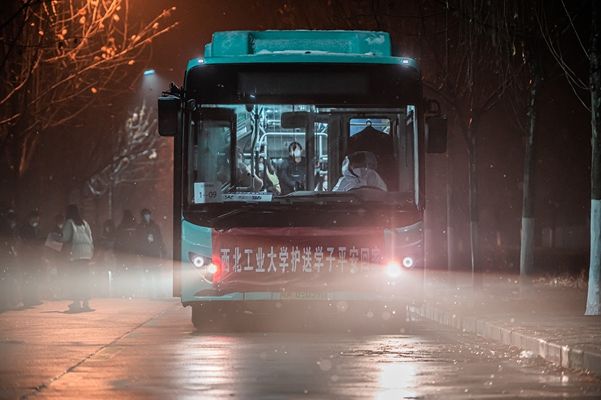2022年1月24日凌晨,西安,西北工业大学长安校区,数十辆大巴车开入校园,长安校区首批离校返家学子在学校的暖心护送下,点对点转运至西安市内“两站一场”,有序踏上返家之路。